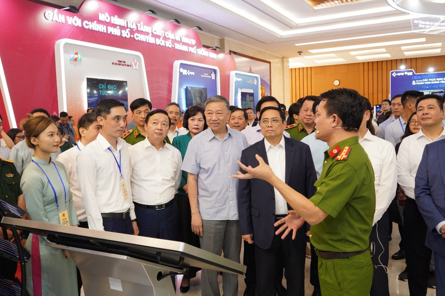 Thủ tướng Phạm Minh Chính cùng Đại tướng Tô Lâm và đoàn đại biểu thăm gian triển lãm các sản phẩm công nghệ của Tổng công ty